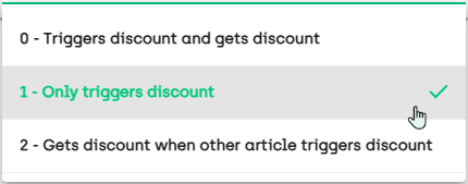 For each article* that you add to the discount group in 52ViKING Store Management, you can specify if the article* should: