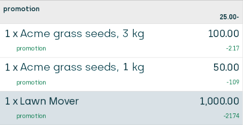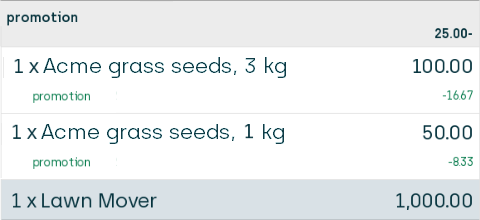 The 25% discount is given on one article. 52ViKING always attempts to give the customer the best deal, so it gives the discount on the most expensive of the two packs of grass seeds, that is the pack that costs 100.00. That means that the customer's 25% discount will amount to 25.00, and the 25.00 discount is then distributed proportionally across all three articles.