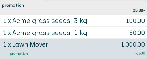 The 25% discount on the most expensive of the two packs of grass seeds is now distributed solely on the lawn mover from the Buy side, but the amount that the customer saves is the same: Their discount still amounts to 25% of 100.00, which is 25.00.