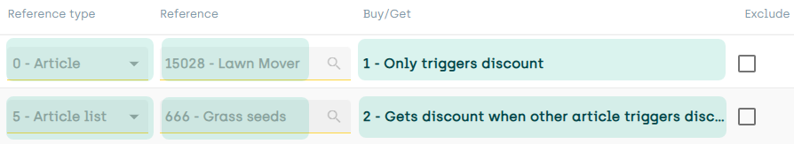 So, on the discount group's Articles tab, we add the Lawn Mover article and specify that it'll only trigger the discount (so it'll be on the Buy side). We then add a Grass seeds article list, and specify that articles from that list will get the discount when the discount is triggered (so they'll be on the Get side):