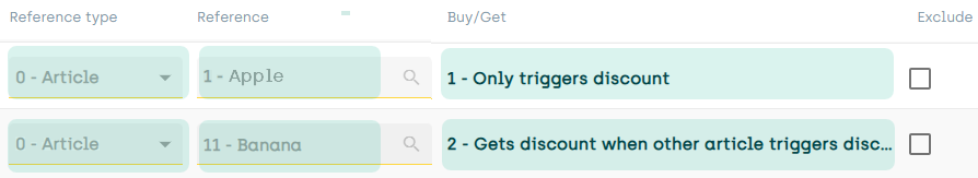 So, on the discount group's Articles tab, we add the Apple article and specify that it'll only trigger the discount. We then add the Banana article, and specify that it'll get the discount when the discount is triggered: