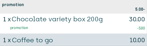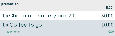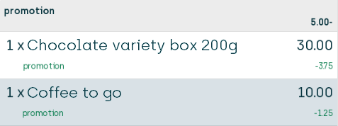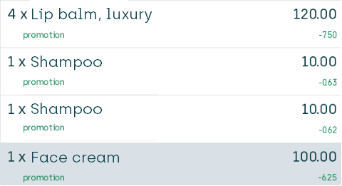 Because the customer buys two bottles of shampoo, the customer's discount will amount to 15.00, and the 15.00 discount is then distributed proportionally across all seven articles (with a little bit of rounding in order to reach a 15.00 discount exactly, which is why the discount on the two bottles of shampoo is 0.63 and 0.62 respectively).