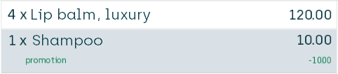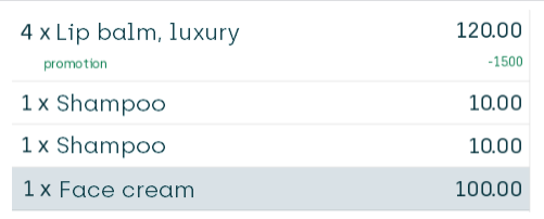 The customer must buy four articles from the Buy side to trigger the discount, so let's sell four lip balms from the Buy side and some differently priced articles from the Get side to view the results of our different discount distribution options on the POS's journal.