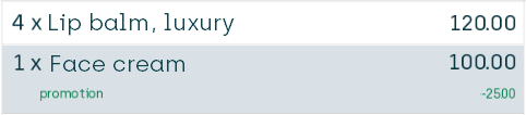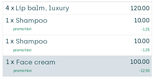 When the customer buys for more than 100.00 of lip balms from the Buy side, they'll get a 25.00 discount on the total price of the articles that they buy from the Get side (that is the face cream in this example):