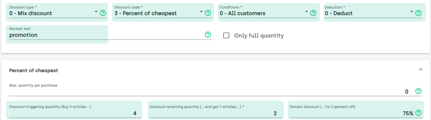 Percent of cheapest (example from quick service restaurant: Buy four soft drinks and get 50% discount on the two cheapest burgers)
