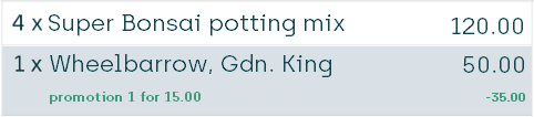 Now, when the customer buys for more than 100.00 of gardening articles from the Buy side, they're able to get one wheelbarrow from the Get side for 15.00 as opposed to its normal price of 50.00, which is a saving of 35.00: