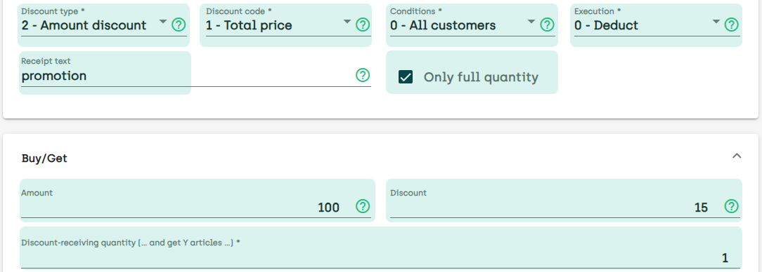 With Buy side / Get side, you also have the flexibility to decide how the discount should be distributed across the articles that the customer buys from the discount group.